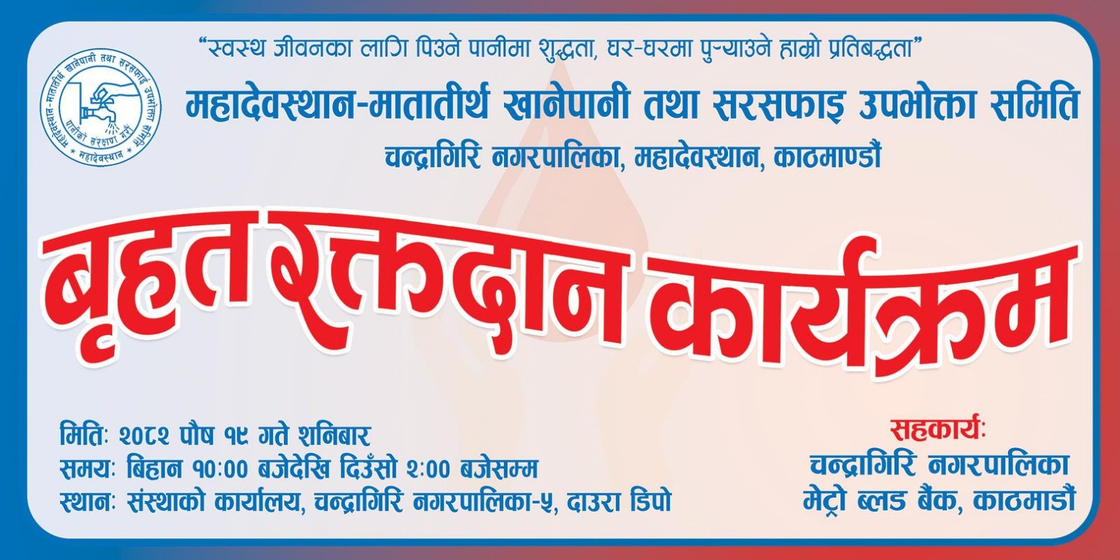 आउँदो शनिबार (पाैष १९) रक्तदान शिविर आयोजना गर्दै महादेवस्थान-मातातिर्थ खानेपानी