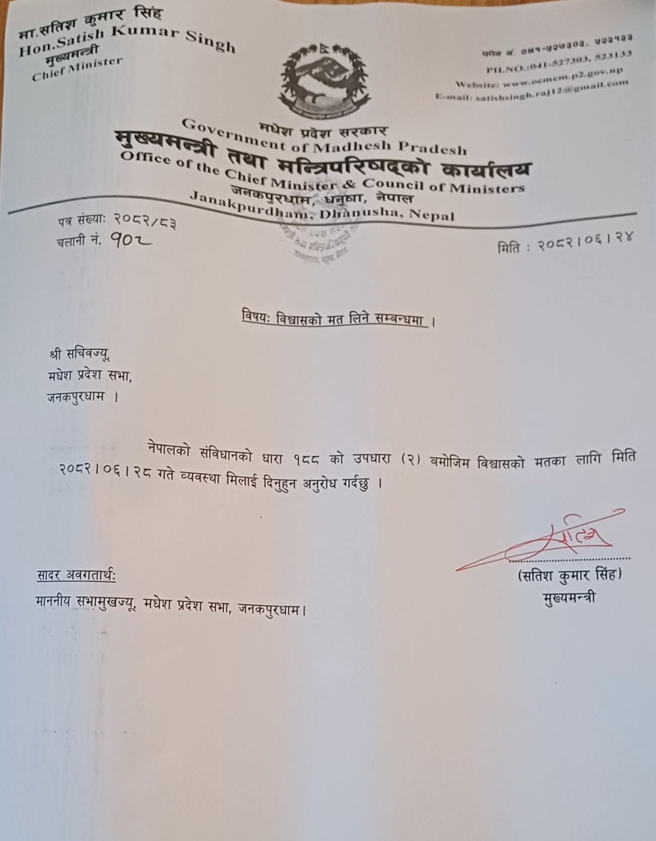 मुख्यमन्त्री सिंहले आज मधेश प्रदेश सभालाई पत्र लेखेर यहि असोज २८ गते विश्वासको मत लिने व्यवस्था मिलाई दिन आग्रह गरेका छन् ।