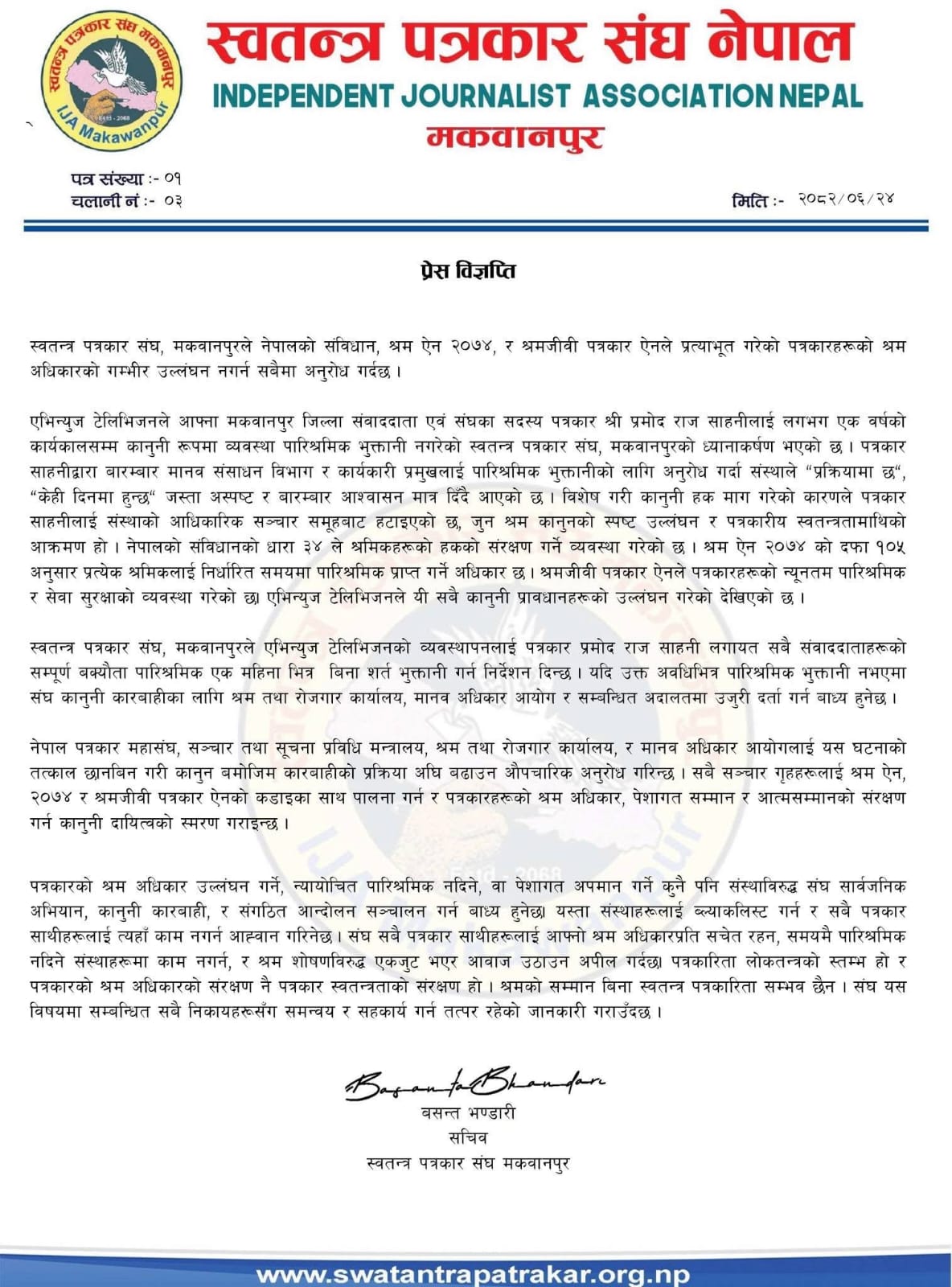संघले सबै सञ्चार गृहहरूलाई श्रम ऐन र श्रमजीवी पत्रकार ऐनको कडाइका साथ पालना गर्न र पत्रकारहरूको श्रम अधिकार, पेशागत सम्मान र आत्मसम्मानको संरक्षण गर्न कानुनी दायित्वको स्मरण गराएको छ ।