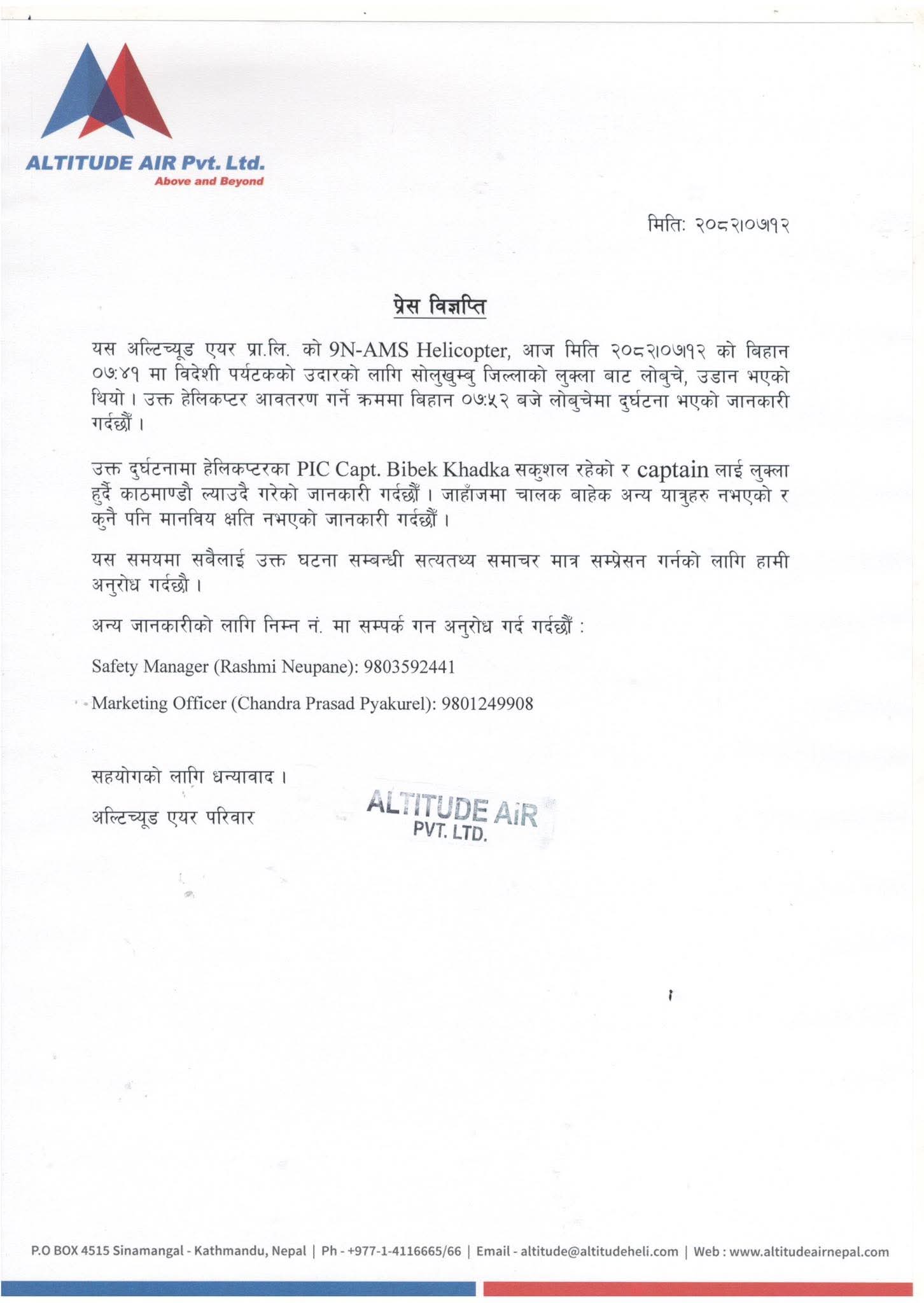 कम्पनीले दुर्घटनामा हेलिकोप्टरका पाइलट क्याप्टेन विवेक खड्का सकुशल रहेको र क्याप्टेनलाई तत्काल उद्धार गरी सुरक्षित स्थानमा ल्याइएकाले कुनै मानवीय क्षति नभएको कम्पनीले स्पष्ट गरेको छ । अन्य यात्रु तथा चालकबाहेक कोही नभएको जानकारी पनि विज्ञप्तिमा उल्लेख छ ।