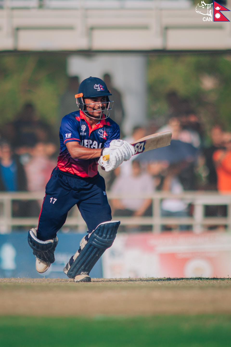 जारी खेलमा पाँँच चौंका एक छक्का सहित उनले १२६ बलमा १०० रन पुर्याए । टस जितेर नेपालले पहिला ब्याटिङ गर्ने निर्णय गरेको थियो ।