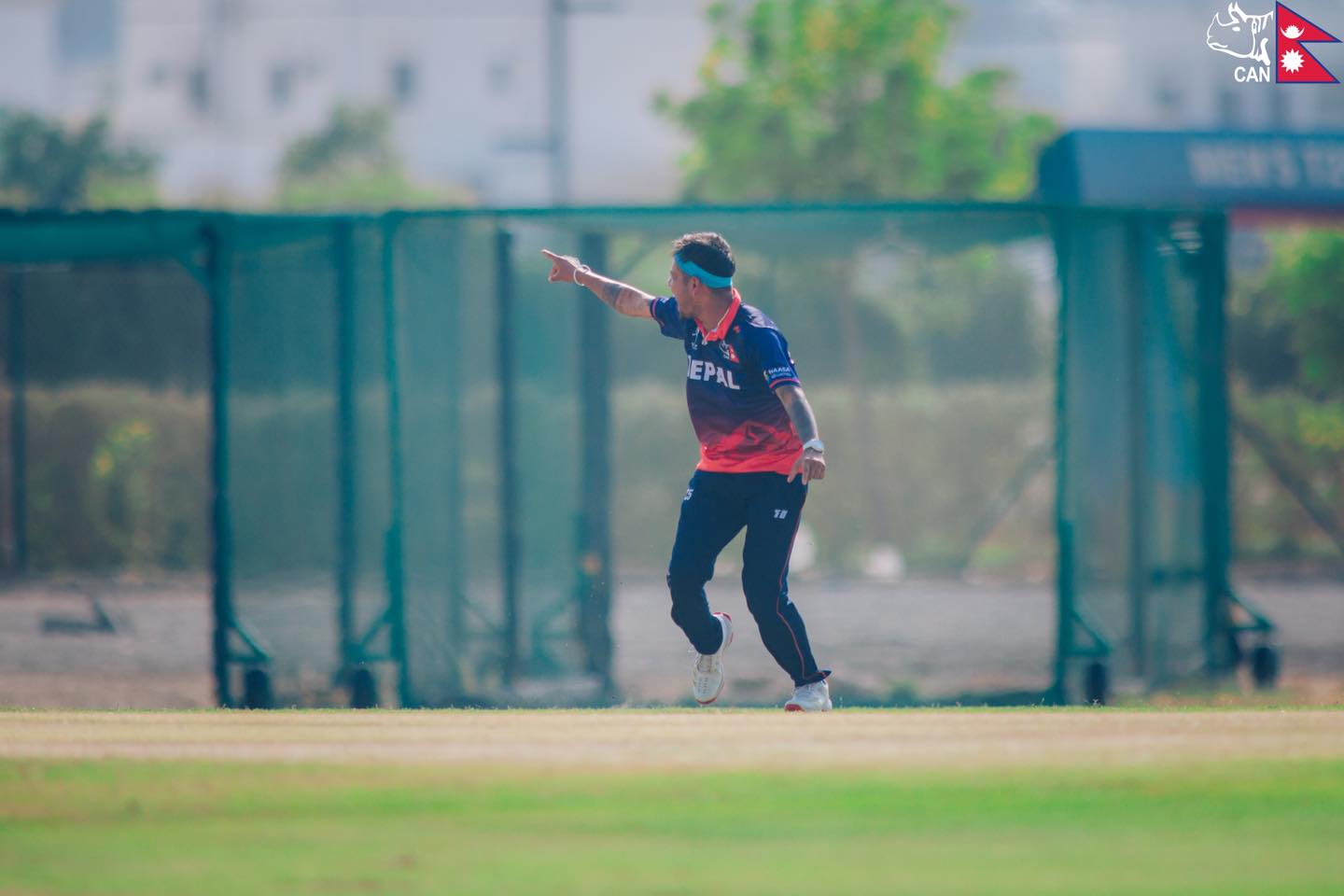 नेपालका लागि सन्दीप लामिछानेले तीन विकेट लिए भने नन्दन याद, करण केसी र गुल्सन झाले समान एक– एक विकेट लिए ।