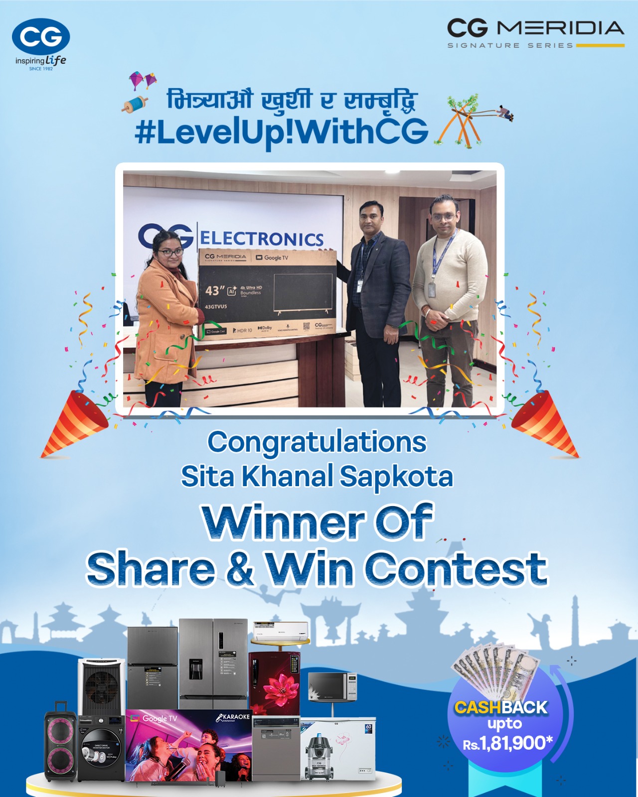 काठमाडौं । सीजी ब्रान्डले दसैं टिका फोटो शेयर एण्ड विन कन्टेस्ट की विजेता सीता खनाल सापकोटालाई ४३ इन्चको अत्याधुनिक सीजी मेरिडिया ४३ अल्ट्रा एजडी टेलिभिजन प्रदान गरेको छ ।