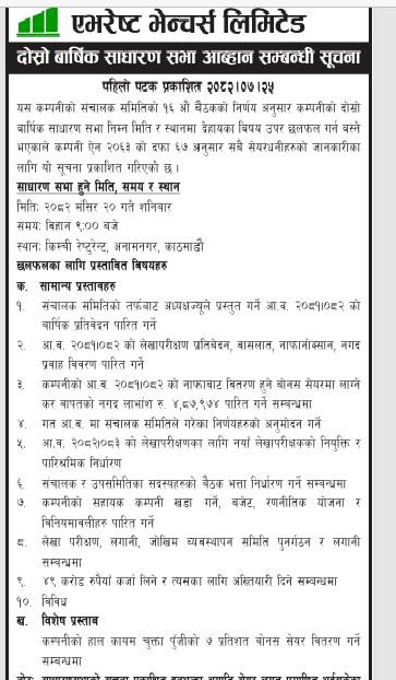 कम्पनीको संचालक समितिको बैठकले आफ्ना सेयरधनीका लागि सात प्रतिशत बोनस सेयर र सो वापत लाग्ने कर प्रयोजनका लागि ४ लाख ८७ हजार नौ सय ७४ रुपैयाँ नगद लाभांश वितरणको प्रस्तावसहित आउने मंसिर २० गते दोस्रो बार्षिक साधारणसभा डाकेको छ ।