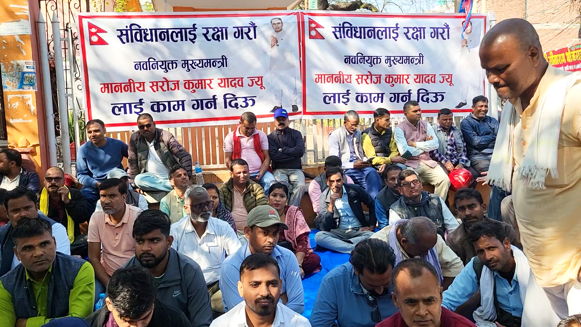 उनीहरुले संविधानको रक्षा गरौ, मुख्यमन्त्री यादवलाई काम गर्न देउ लेखिएको ब्यानर राखेर धर्नामा बसेका छन् ।