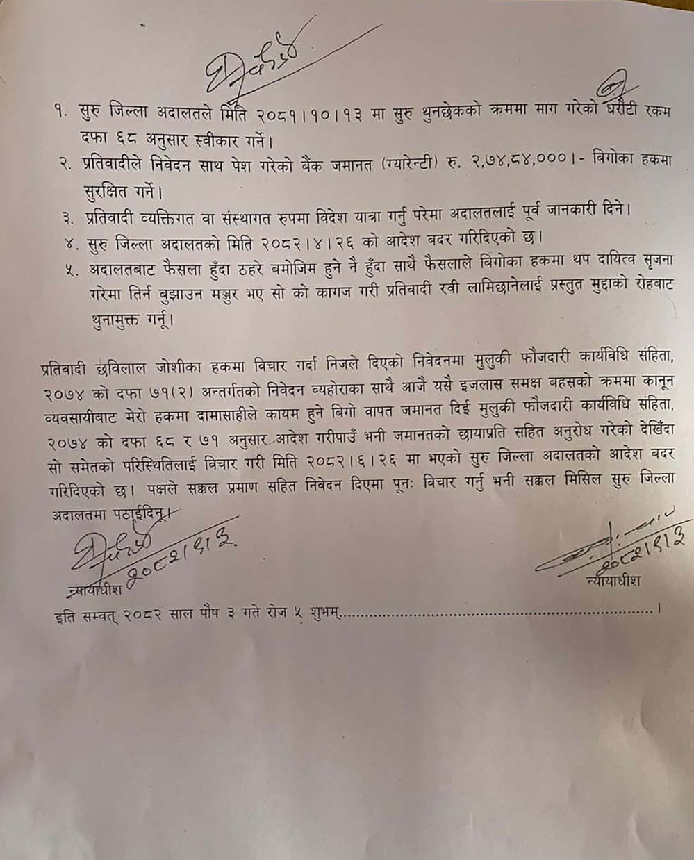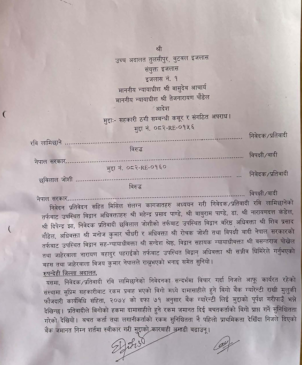 उच्चले बिगो बराबर धरौटी माग गर्ने आदेश गरेको हो । उच्चले धरौटी माग गरेपछि सो बराबरको रकम बुझाएर उनी थुनामुक्त हुने छन् । उच्चले उनको हकमा आफ्नो दायित्व बराबरको विगो राख्न तयार भएको भनि निवेदन समेत दिएको देखिएको भन्दै पुर्पक्षका लागि थुनामा पठाउने यसअघिको आदेश बदर गर्दै धरौटीमा रिहा गर्ने आदेश गरेको हो । यो आदेशपछि नख्खु कारागारमा रहेका लामिछाने रिहा हुने छन् ।