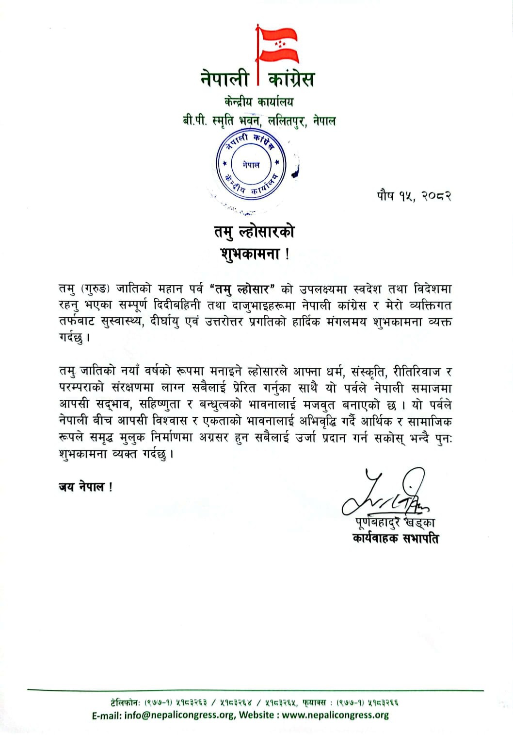 शुभकामना सन्देशमा उनले तमु ल्होसारले सबै नेपालीलाई आर्थिक तथा सामाजिक रूपमा समृद्ध राष्ट्र निर्माणतर्फ अग्रसर हुन ऊर्जा प्रदान गरोस् भन्ने कामनासमेत व्यक्त गरेका छन् ।