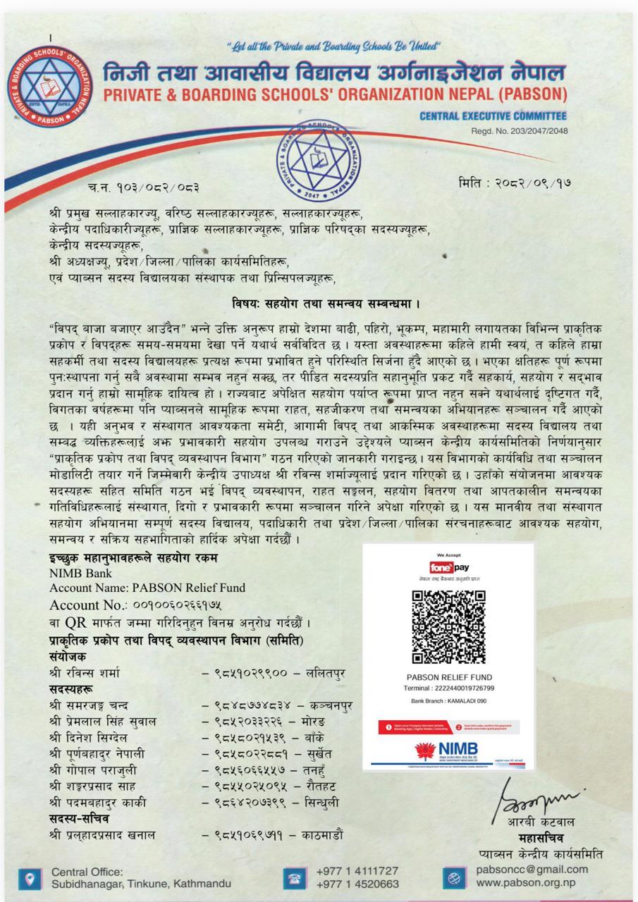 संस्थाले यस मानवीय तथा संस्थागत सहयोग अभियानमा सम्पूर्ण सदस्य विद्यालय, पदाधिकारी तथा प्रदेश, जिल्ला र पालिका संरचनाहरूलाई सक्रिय सहकार्य र समन्वयका लागि आह्वान गरेको छ ।